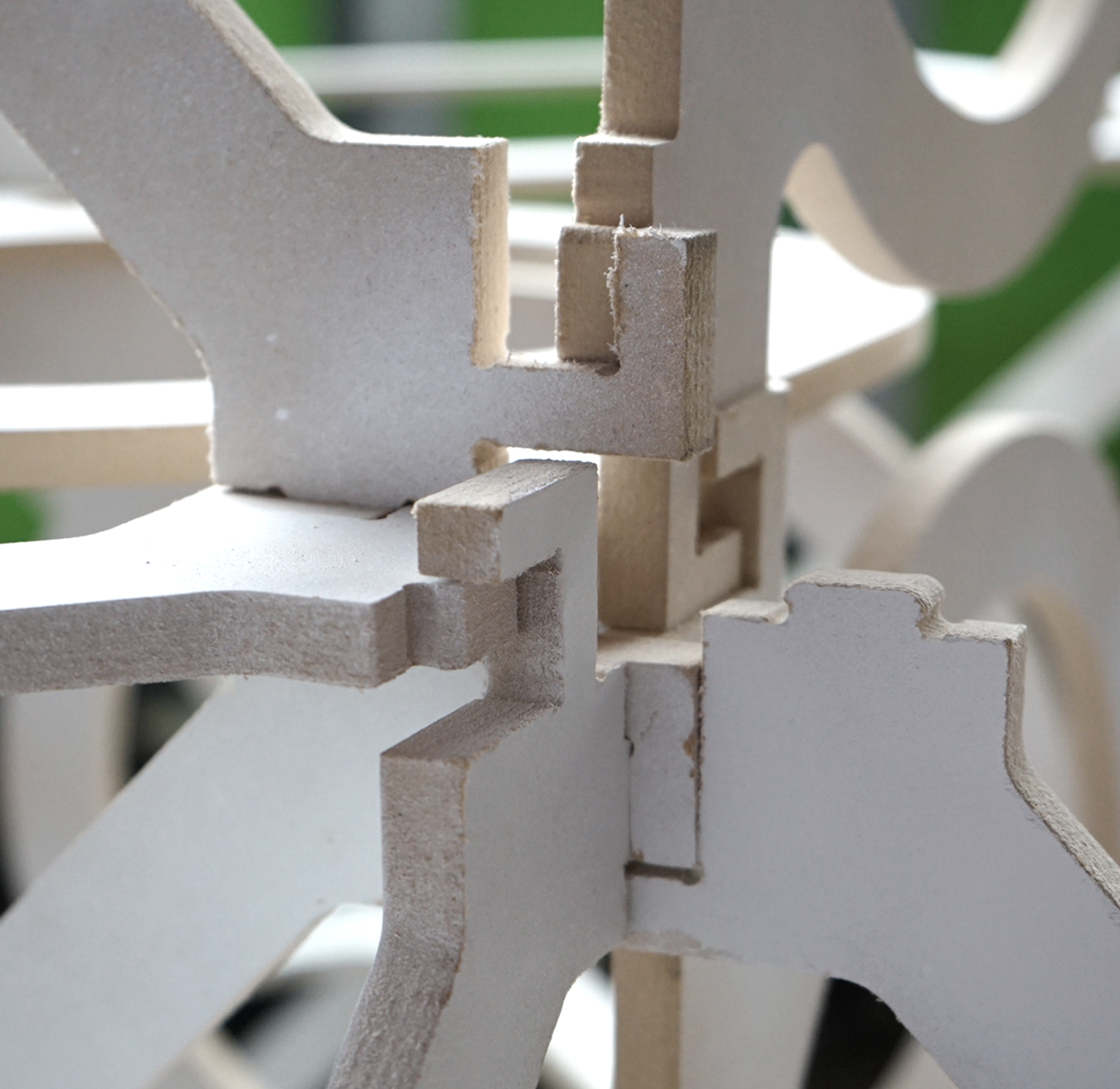 The research explores the structural potential of digitally fabricated, friction-based assemblies—three-dimensional structures built without fasteners, nails, or glue. By adapting traditional mortise-and-tenon joinery for modern flat-cut manufacturing, the project demonstrates a system that balances manufacturing simplicity with structural integrity. Through a combination of digital simulations and physical Instron machine testing, the team analyzed failure patterns to optimize these lightweight structures for practical architectural applications.