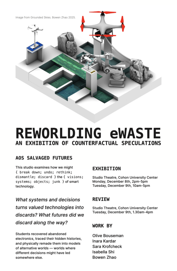 This semester, students recovered abandoned electronics, traced their hidden histories, and physically remade them into models of alternative worlds—worlds where different decisions might have led somewhere else. The exhibition presents speculative objects, zines, and a collaborative publication exploring repair, e-waste, and technological futures.